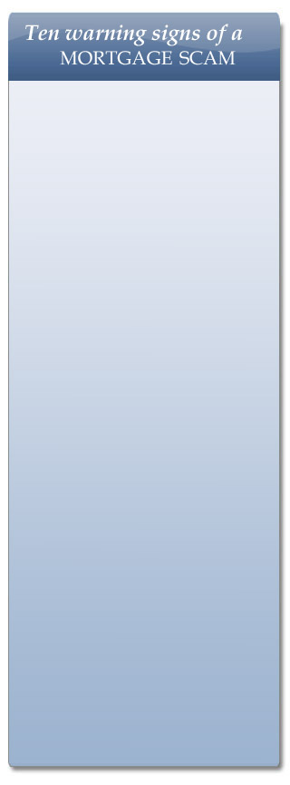 "I guarantee I will save your home— trust me. Beware of guarantees that a person or company can stop foreclosure and allow you to remain in your house."